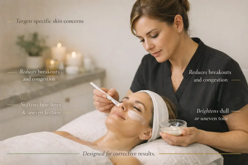 Our targeted facial treatments are designed to focus on what your skin actually needs. Whether you’re dealing with breakouts, uneven tone, fine lines, rosacea, or congestion, each session is carefully customized to correct specific concerns and support long-term skin health.